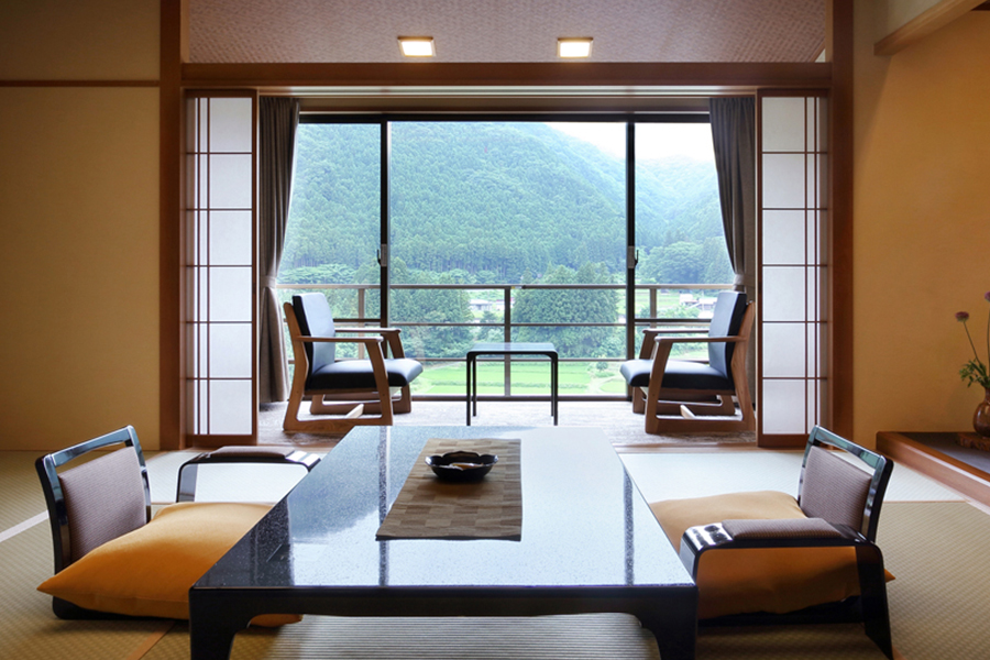 客室は、窓一面に鬼怒川の渓流と里山の風景を望む、本館の和室一間(12.5畳)。木の温もりあふれるお部屋にてゆっくり寛ぐことができます。